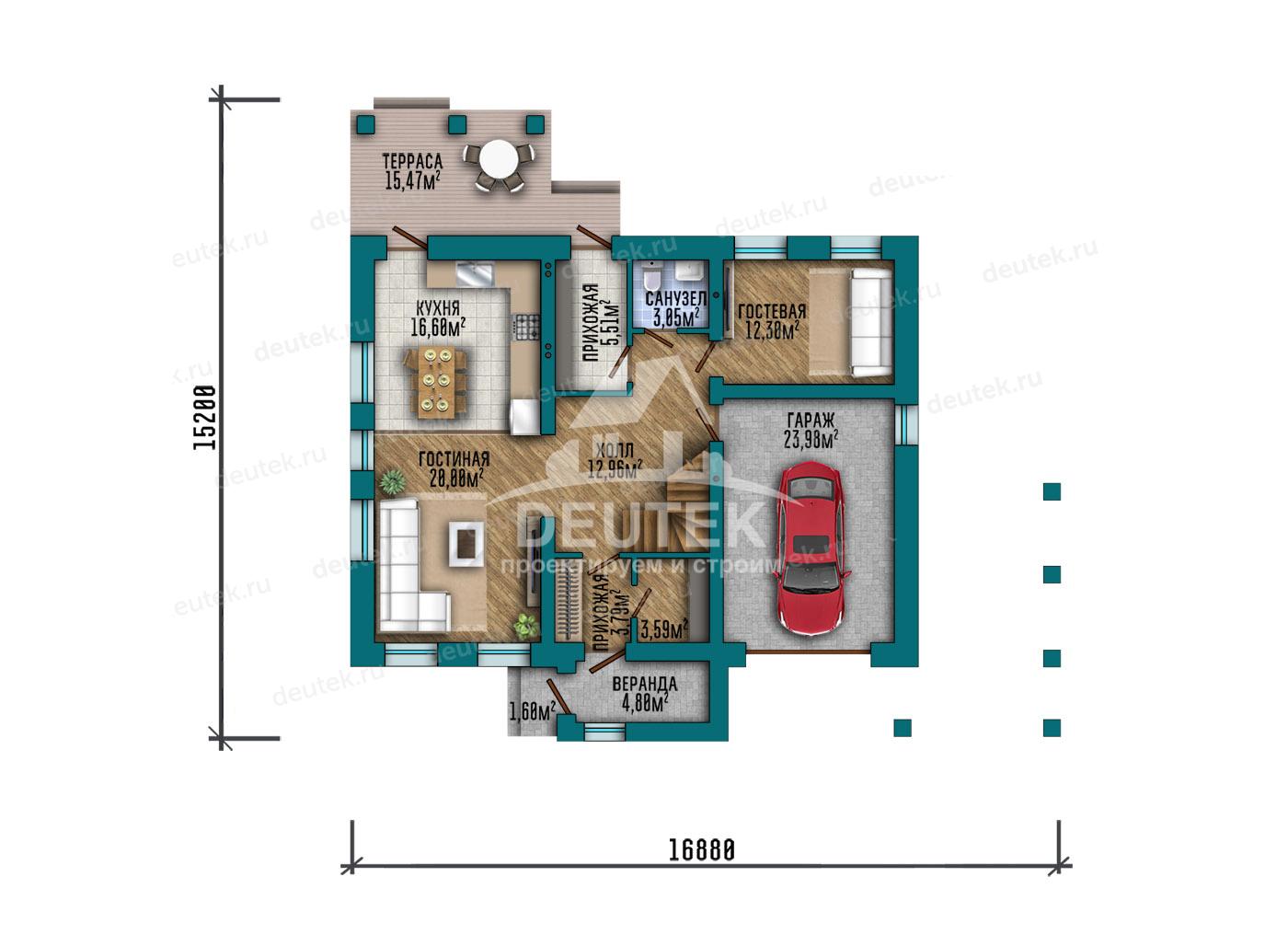 Габариты дома: 16.88 x 15.23 м
