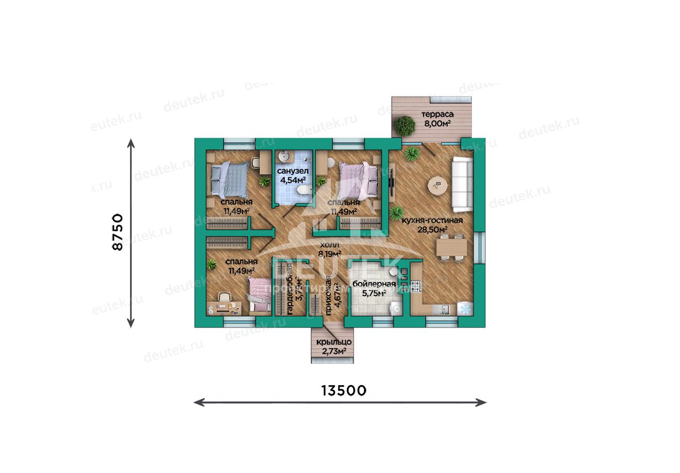 Габариты дома: 13.50 x 8.75 м