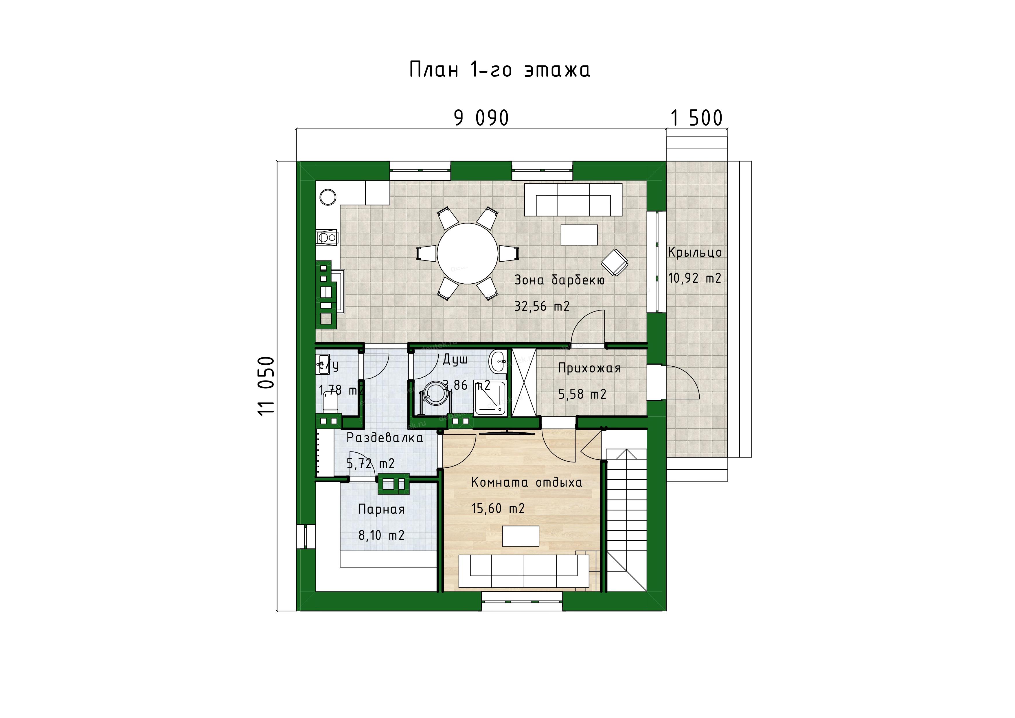 Проект бани с парной и зоной барбекю с размерами 11 м на 11 м - P258-1